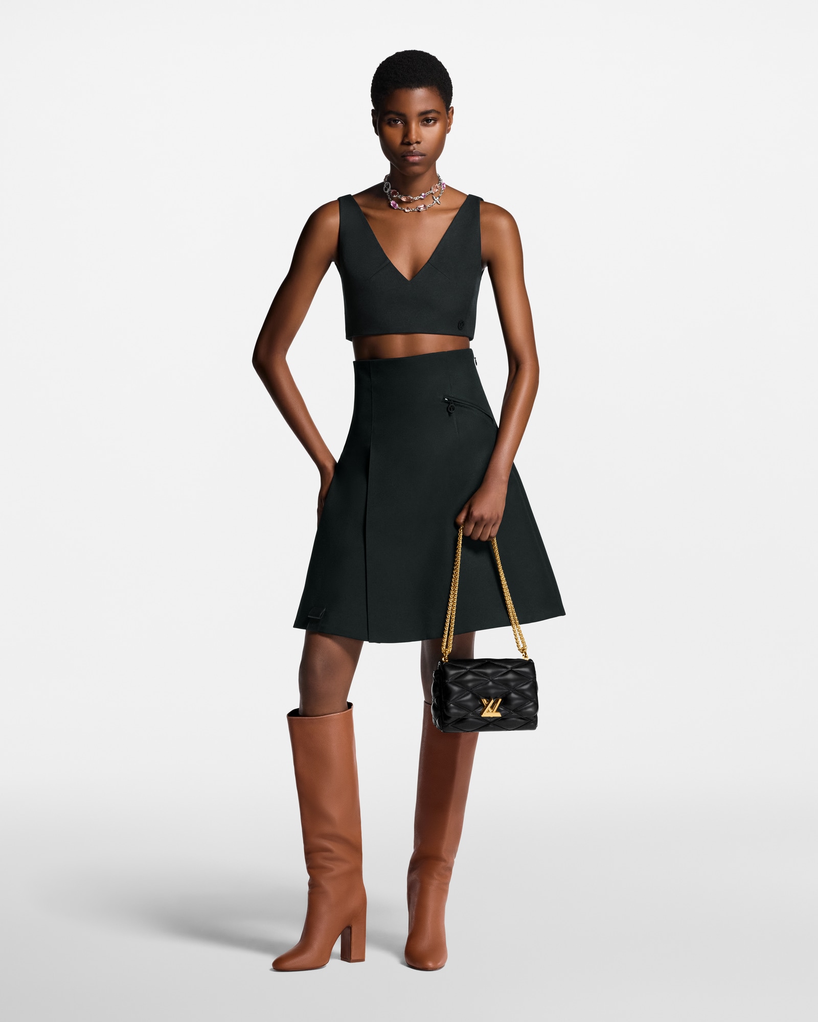 하우스의 상징적인 테크니컬 개버딘 소재로 절제된 매력을 담아 선보이는 크롭 톱. 몸을 부드럽게 감싸는 유선형 실루엣. 앞면의 날렵한 V 네크라인을 재현한 뒷면 디자인. 톤온톤 LV 서클 참을 장식해 은은한 포인트를 준 웨이스트 밴드. 드러나지 않는 지퍼 잠금장치를 구성하여 깔끔한 라인을 완성한 아이템.