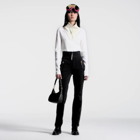 스포티하면서도 세련된 스키 팬츠. 테크니컬 저지 소재로 완성한 날렵하고 타이트한 핏. 구조적인 하이 웨이스트와 다리 부분의 은은한 플레어 실루엣 덕분에 더욱 길어보이는 디자인. 실용적인 발목 부분의 지퍼와 여밀 수 있는 포켓을 구성하여 다양하게 스타일링할 수 있는 아이템. 그래픽한 루이 비통 지퍼 풀러 디테일.