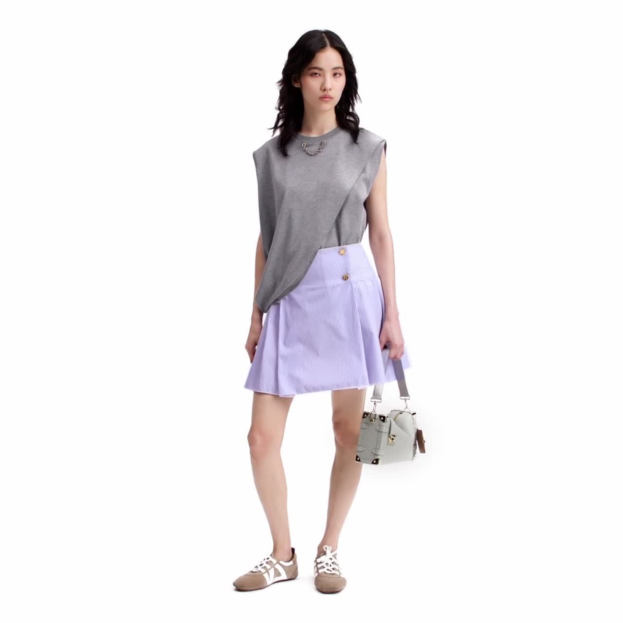 모던한 감각으로 재해석해 선보이는 고급스러운 티셔츠. 가벼운 면 저지 소재. 리브드 크루 네크라인을 더한 여유로운 핏의 슬리브리스 실루엣. 가슴 부분의 비대칭적인 레이어드 디테일이 우아한 드레이핑 효과를 자아내는 디자인. 세련된 시그니처 룩을 완성하는 LV 체인 장식.