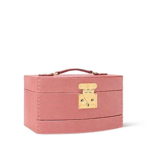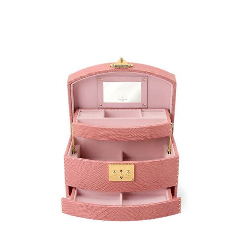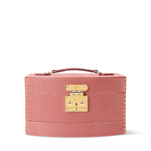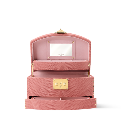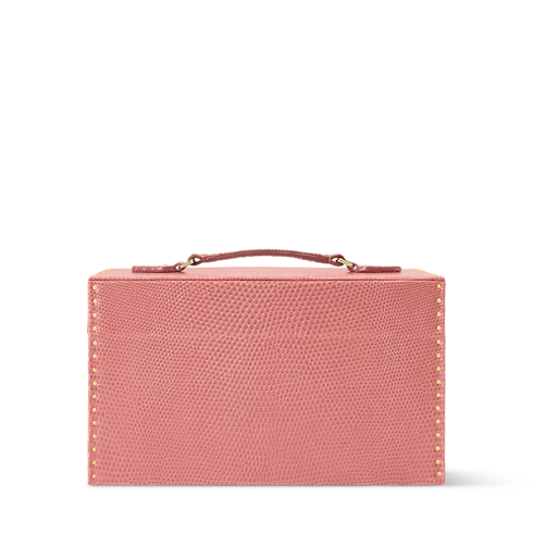 앤 오브 오스트리아의 화려한 내실에서 영감을 받은 베니티 셰리. 옆면을 따라 은은하게 리벳을 더한 고급스러운 리자드 가죽 소재. 절제된 살몬 색조와 매칭되는 색상의 안감. 부드럽게 작동하는 슬라이딩 시스템으로 세 개의 서랍이 동시에 열려 내부를 빠르게 확인할 수 있는 디자인. 컴팩트한 크기와 상단 손잡이 덕분에 간편하게 들고 다닐 수 있는 수납공간 넉넉하고 가벼운 아이템.
