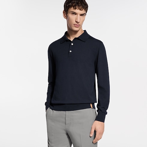 은은하게 우아한 분위기를 자아내는 네이비 블루 색상의 긴소매 폴로 셔츠. 뛰어난 부드러움과 내구성을 선사하는 메리노 울, 실크 및 캐시미어 혼방의 최고급 니트 소재. 왼쪽 밑단에 더한 VVN 가죽 탭이 하우스의 트렁크 제작 헤리티지를 연상시키는 디자인. 포멀한 스타일부터 주말 룩까지 폭넓게 연출할 수 있는 익스클루시브한 아이템.