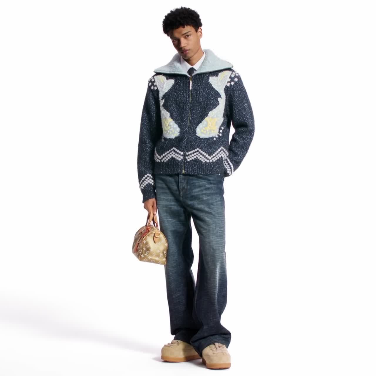 핸드메이드 분위기를 자아내는 다크 블루 색상의 면 및 울 니트 블루종. 퍼렐 윌리엄스와 니고가 협업한 2025 가을-겨울 패션쇼에서 선보인 인따르시아 및 자수 모티프가 돋보이는 디자인. 니고의 일본 헤리티지를 연상시키는 아이템. 앞면의 LV 시그니처가 새겨진 두 개의 비단잉어 모티프 및 뒷면의 사쿠라 체리 블라썸과 일본어 시그니처 레터링. 포근한 스타일에 세련된 감각을 더하는 진주 장식 지퍼 풀러.