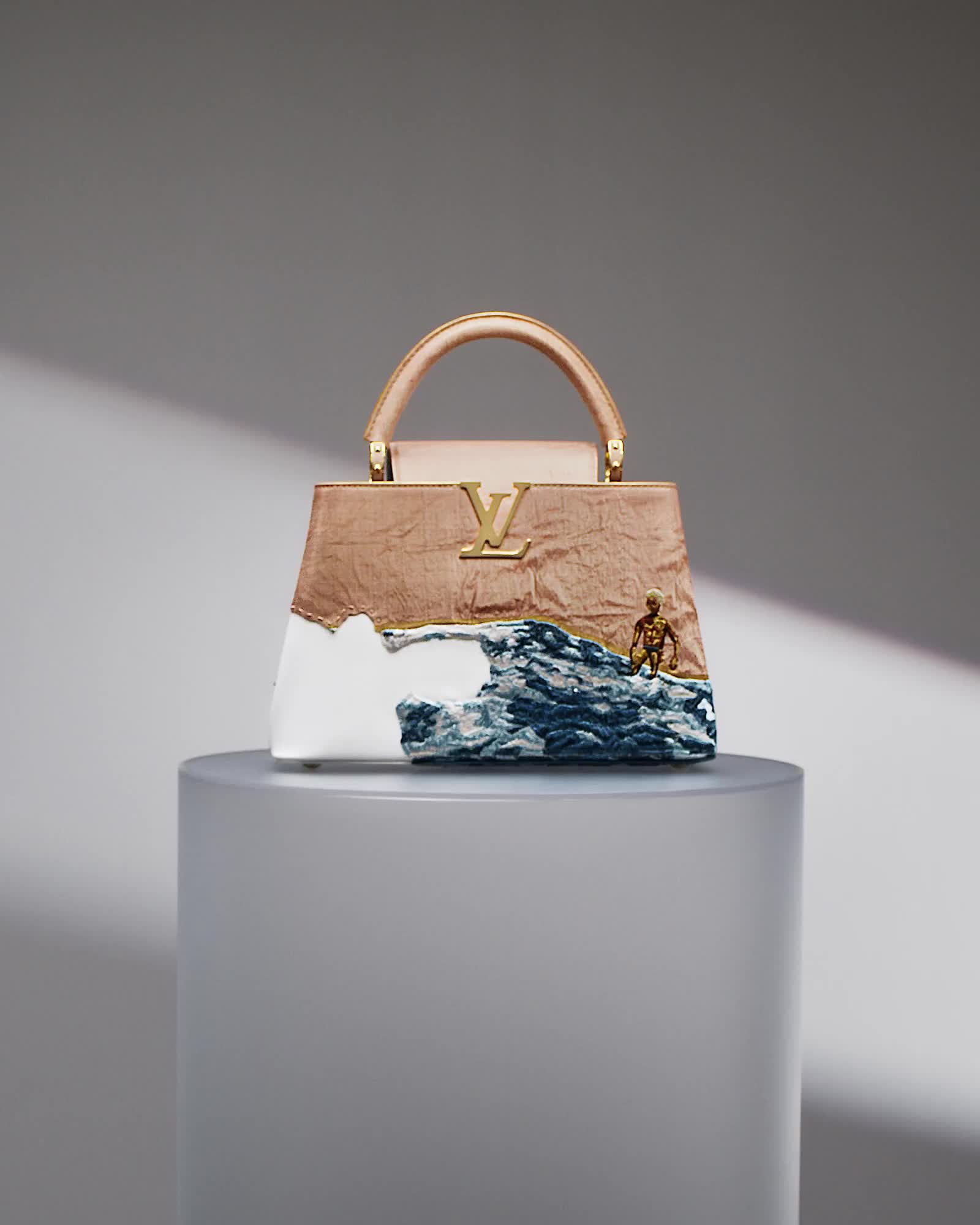 예술과 패션의 융합이라는 가치를 바탕으로, 장게와의 아티카퓌신은 그녀가 원작에서 선보인 브론즈 실크 패치워크를 스캔하여 부드러운 가죽 위에 고해상도 프린트로 옮기고, 이 과정에서 원작의 자연스러운 주름을 그대로 살려 의도적으로 투박한 스티칭을 통해 카퓌신에 부착되었습니다. 그녀의 작품에서 반복되는 주제인 골드 디테일은 수영장 가장자리의 윤곽을 따라 이어지고, 이는 가방 상단의 메탈릭 LV 시그니처로 이어집니다. "저는 질감과 촉감에 대한 애정을 가지고 있기 때문에 패브릭을 이용한 작업은 거의 필연이나 다름없었어요." - 빌리 장게와