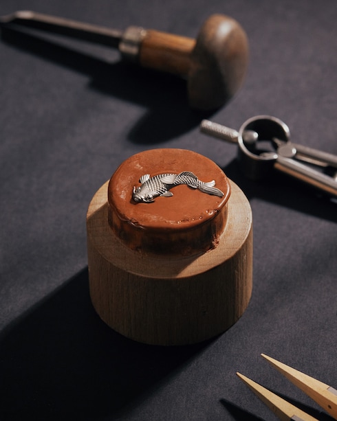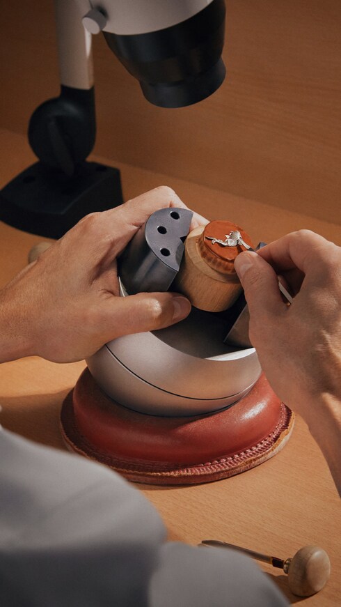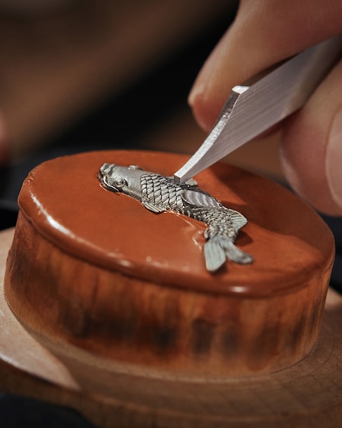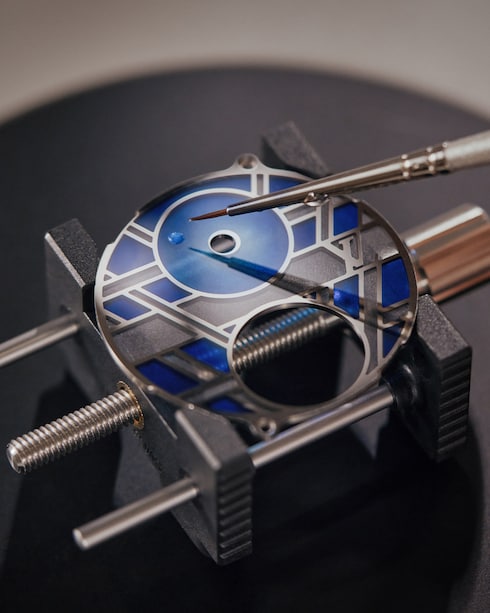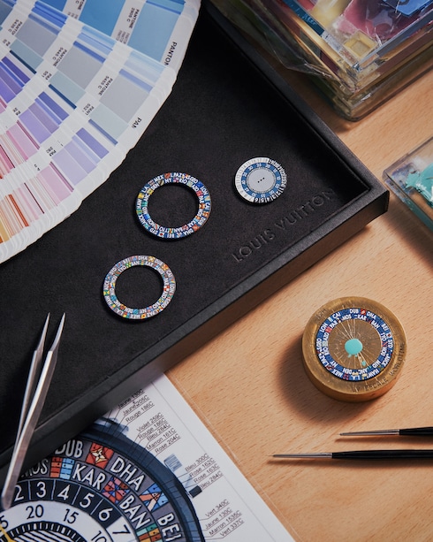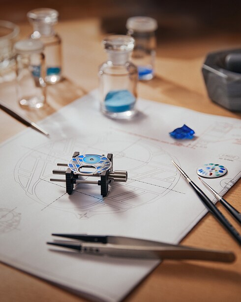 에나멜링은 에나멜과 가마의 열이 만나 색의 광채와 강렬함을 드러내는 까다로운 예술로, 라 파브리크 뒤 떵 루이 비통의 에나멜 기법 수석 장인들은 수년에 걸쳐 고도의 기술과 그 비법을 터득해왔습니다. 골드 클루아조네(칠보, cloisonné) 구조를 바탕으로 투명함과 대비가 돋보이는 플리크아주르(plique-à-jour) 기법, 그리고 얇은 금박 조각으로 에나멜 층을 꾸미는 파이요네(paillonné) 기법이 대표적입니다.