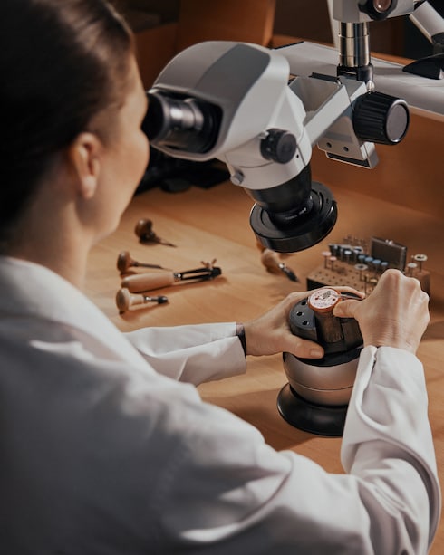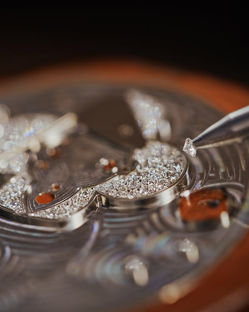 베젤과 케이스, 다이얼을 눈부신 광채로 장식하는 보석 세팅은 제작 공방의 작품에 고귀함을 더합니다. 먼저 주얼리 수석 장인이 금속을 정교하게 가공한 후, 보석 세팅 수석 장인은 탁월한 섬세함과 예술적 감각으로 보석을 세팅합니다. 장인은 클로즈드 세팅, 클로 세팅, 스노우 세팅과 같은 정교한 기법을 활용하여 눈송이가 휘날리는 듯한 느낌을 선사하는 시적 마감을 구현합니다.