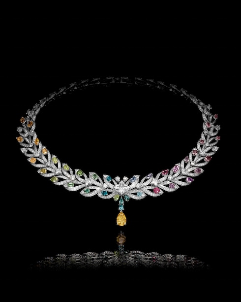 목걸이에는 총 19.71캐럿에 달하는 38개의 컬러 다이아몬드가 무지갯빛 그라데이션으로 세팅되어 있으며, 3캐럿 팬시 비비드(Fancy Vivid) 오렌지-옐로 페어 컷 다이아몬드와 3.88캐럿 LV 모노그램 스타 컷 다이아몬드가 찬란한 포인트를 더합니다.