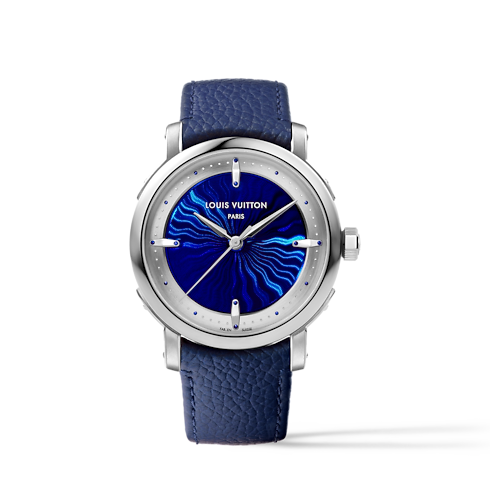 메종의 상징적인 시계 땅부르가 슬림한 케이스, 루이 비통 최초의 일체형 브레이슬릿, 대조적인 마감 처리, 그리고 라 파브리크 뒤 떵 루이 비통이 설계한 독점 오토매틱 무브먼트를 갖춘 유니섹스 디자인으로 새롭게 재해석되었습니다.